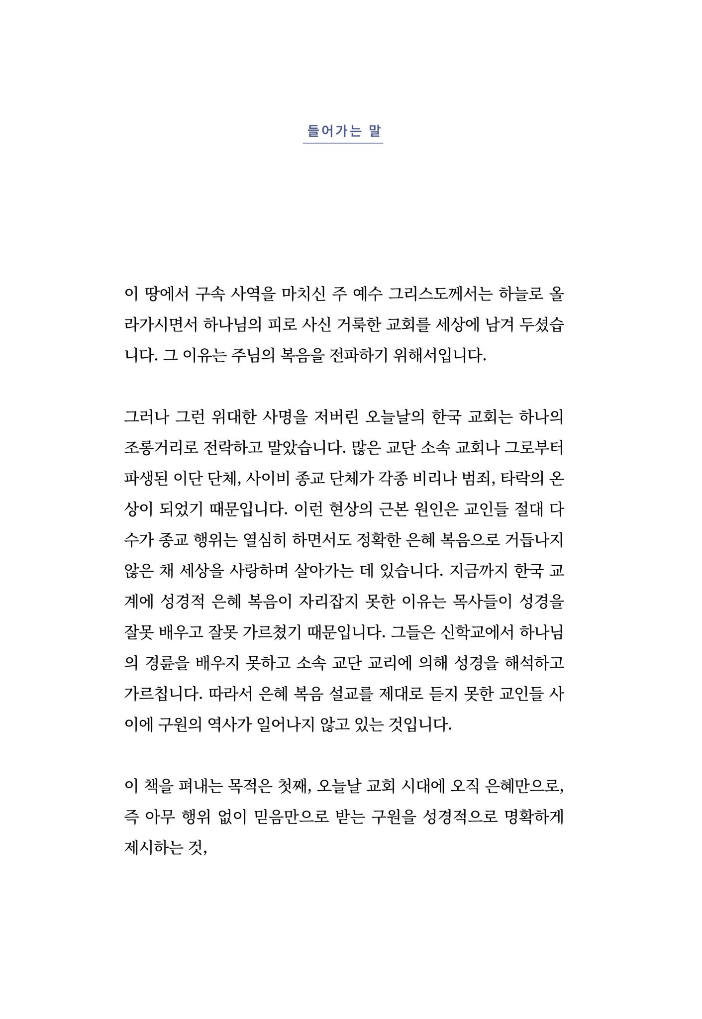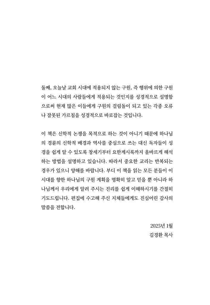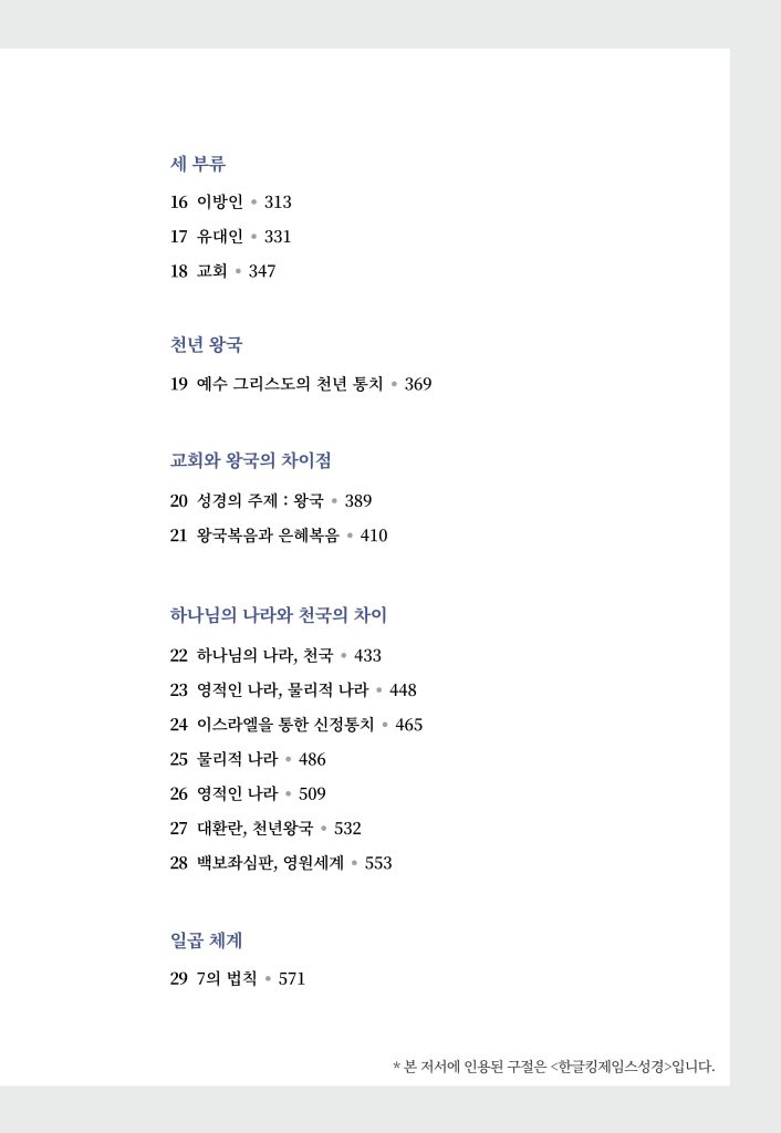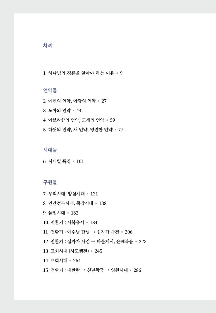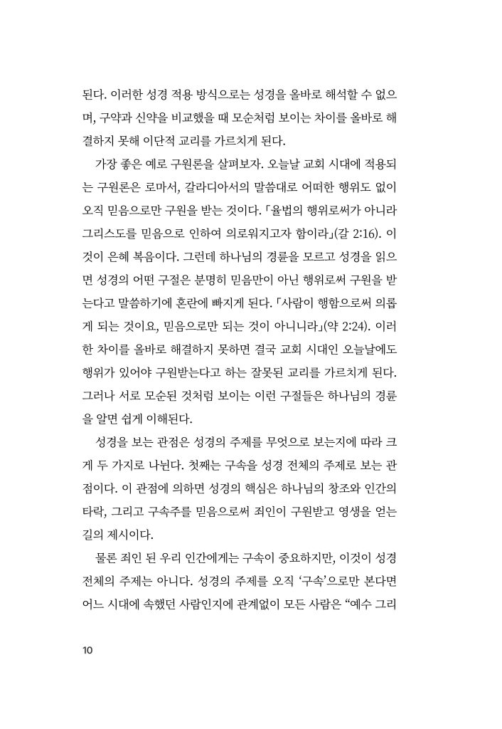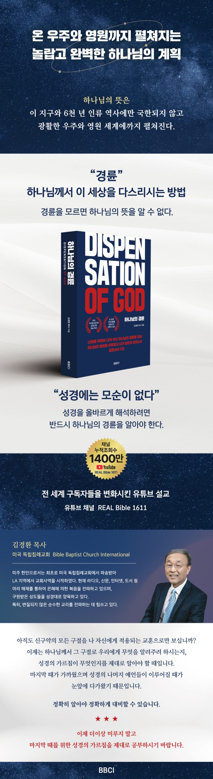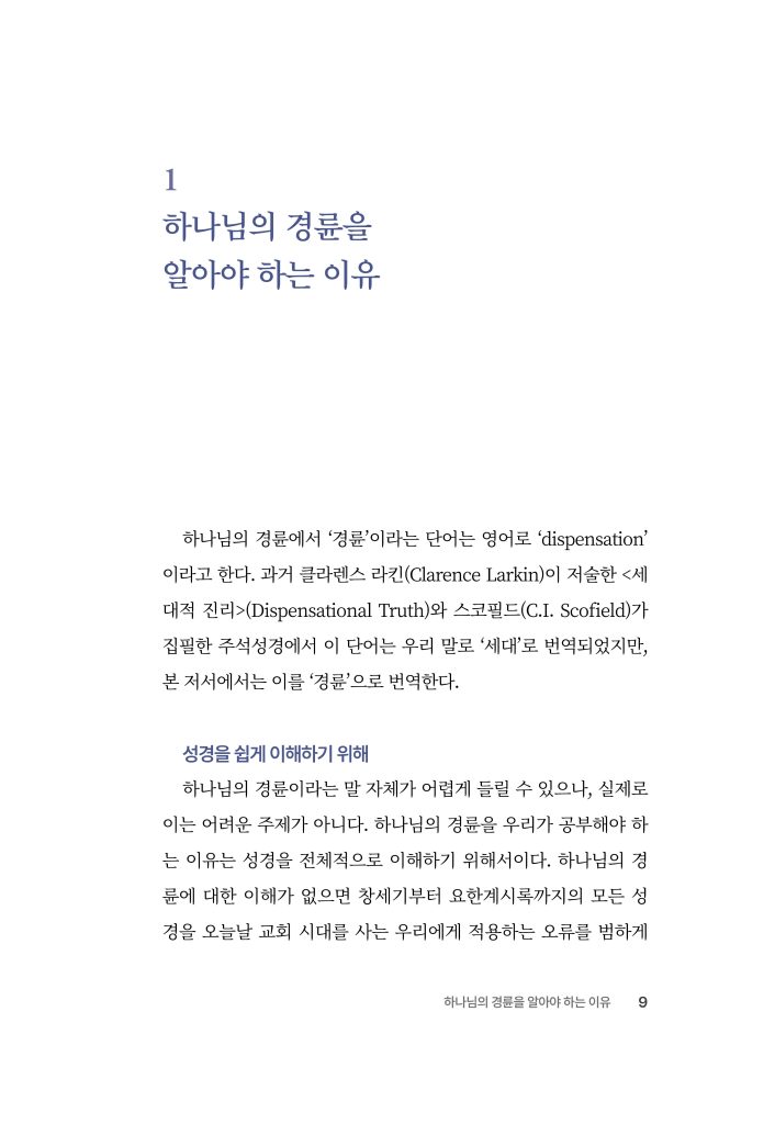 성경을 소설책 읽듯이 읽으면 이해하기도 어렵고 하나님의 말씀들이 서로 모순 된다고 오해할 수 있습니다. 결국 자기 맘대로 해석하고 그렇게 해서 얻은 지식을 남들에게 가르치는 위험한 행동으로 이어질 수 있습니다. 이 책으로 하나님의 경륜을 공부하면 성경을 정확하게 이해할 수 있습니다.