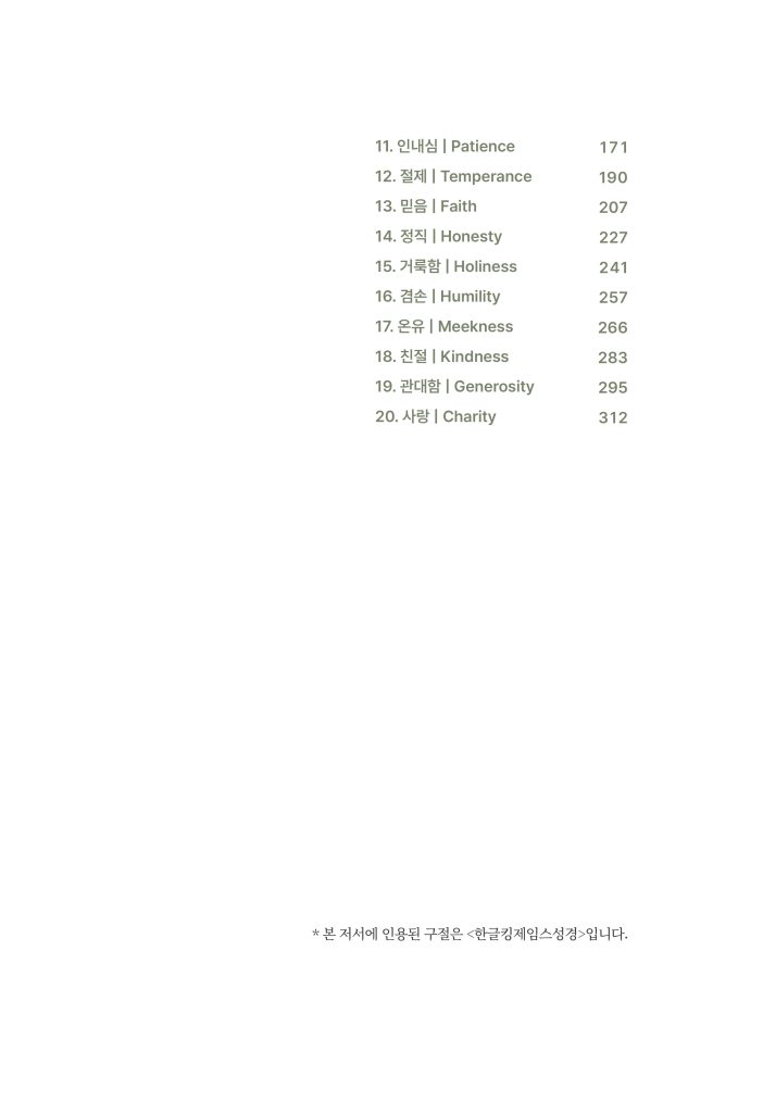 죄의 성품을 갖고 태어난 우리는 결국 구원을 받아도 세상과 타협하여 살아가다 주님의 영광을 가리고 그분과 멀어지게 되기 일쑤입니다. 그리스도인의 성경적 성품을 익혀서 성령 충만함으로 변화받고 선한 열매맺는 그리스도인이 될 수 있게 인도하는 꼭 읽어야할 필독서 입니다. 적극 추천드립니다.