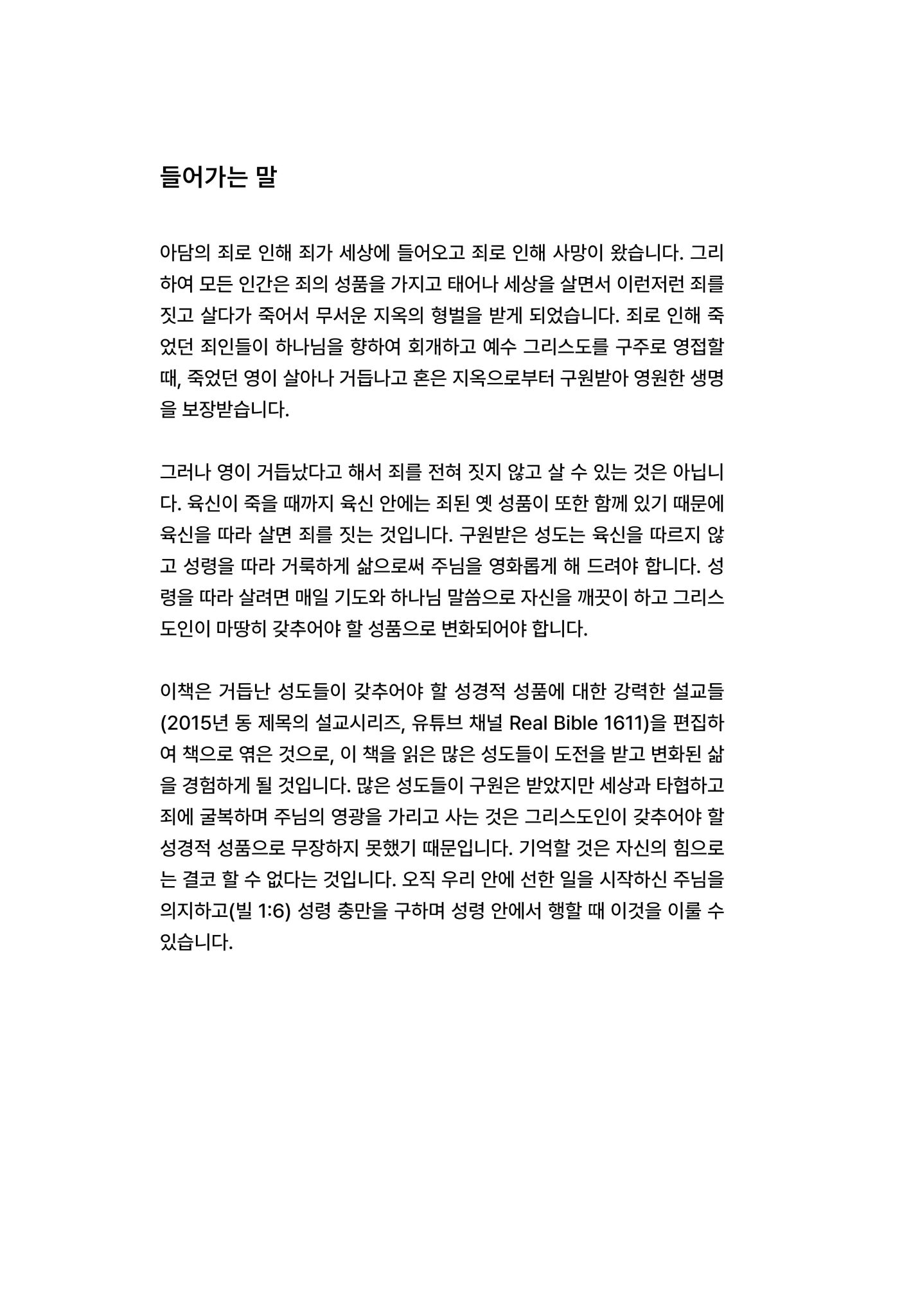거듭난 성도들이 갖추어야 할 성경적 성품에 대한 강력한 설교들을 편집하여 책으로 엮은 것으로, 이 책을 읽은 많은 성도들이 도전을 받고 변화된 삶을 경험하게 될 것입니다.