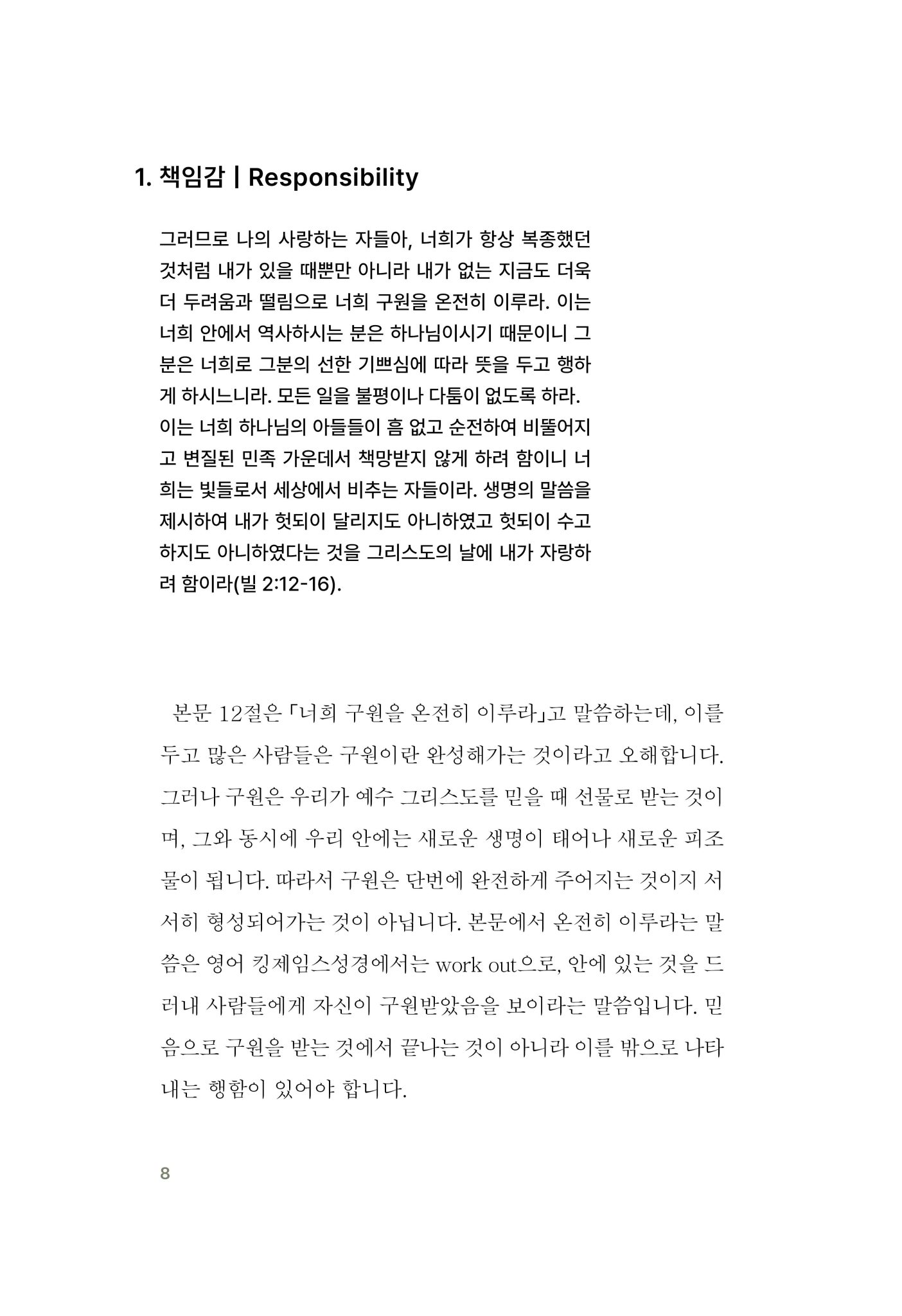 이 책은 진짜 구원받은 성도들이 어떤 마음으로 어떻게 살아야 하는지 구체적으로 설명하고 있습니다. 성경적이지 않은 부분이 없기 때문에, 말씀대로 살아가고 싶은 크리스천에게 큰 도움이 되는 책입니다.